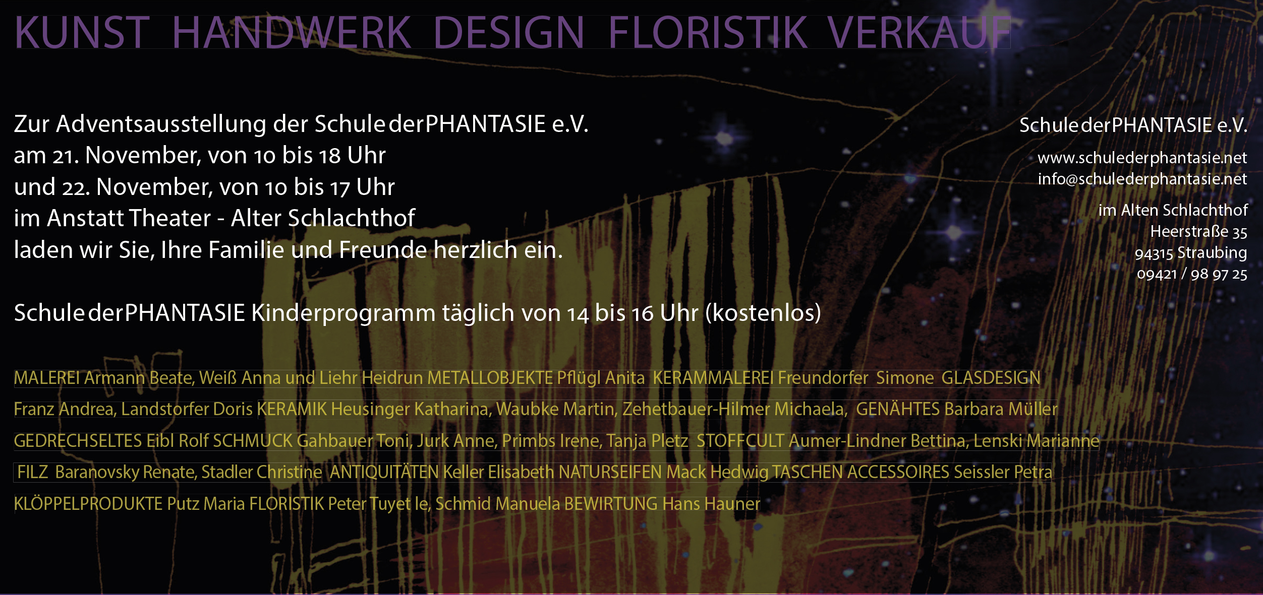 Adventsausstellung 2015 Verfasst von schulederphantasie am 19. November 2015 Am Samstag ist es endlich soweit! 🙂 Teilen mit: Klick, um auf Facebook zu teilen (Wird in neuem Fenster geöffnet) Facebook Klicken, um einem Freund einen Link per E-Mail zu senden (Wird in neuem Fenster geöffnet) E-Mail Gefällt mir Wird geladen …