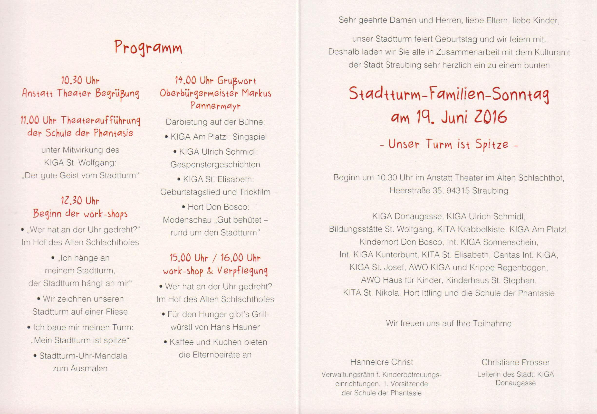 Stadtturm-Familien-Sonntag am 19.06.2016 Verfasst von schulederphantasie am 7. Juni 20167. Juni 2016 Bilder anklicken zum Vergrößern WIR FREUEN UNS DARAUF! 😀 Hier das Programm: Teilen mit: Klick, um auf Facebook zu teilen (Wird in neuem Fenster geöffnet) Facebook Klicken, um einem Freund einen Link per E-Mail zu senden (Wird in neuem Fenster geöffnet) E-Mail Gefällt mir Wird geladen …