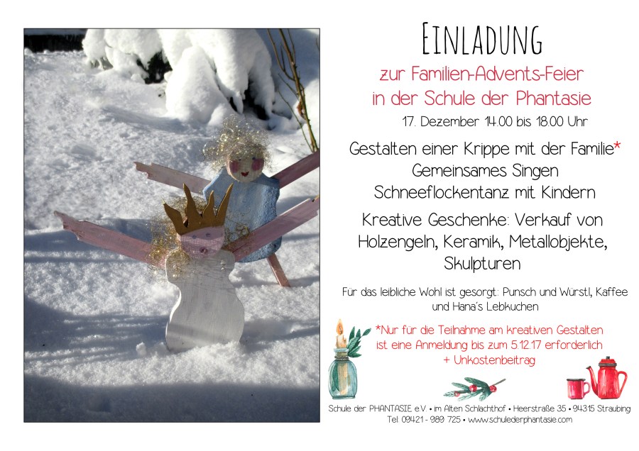 Familien Advents Feier 2017 Verfasst von schulederphantasie am 6. Dezember 2017 Teilen mit: Klick, um auf Facebook zu teilen (Wird in neuem Fenster geöffnet) Facebook Klicken, um einem Freund einen Link per E-Mail zu senden (Wird in neuem Fenster geöffnet) E-Mail Gefällt mir Wird geladen …