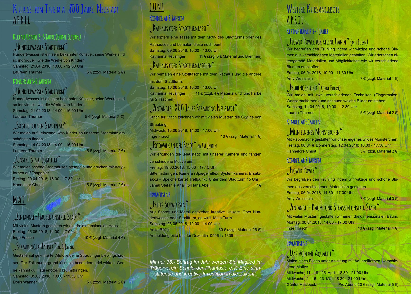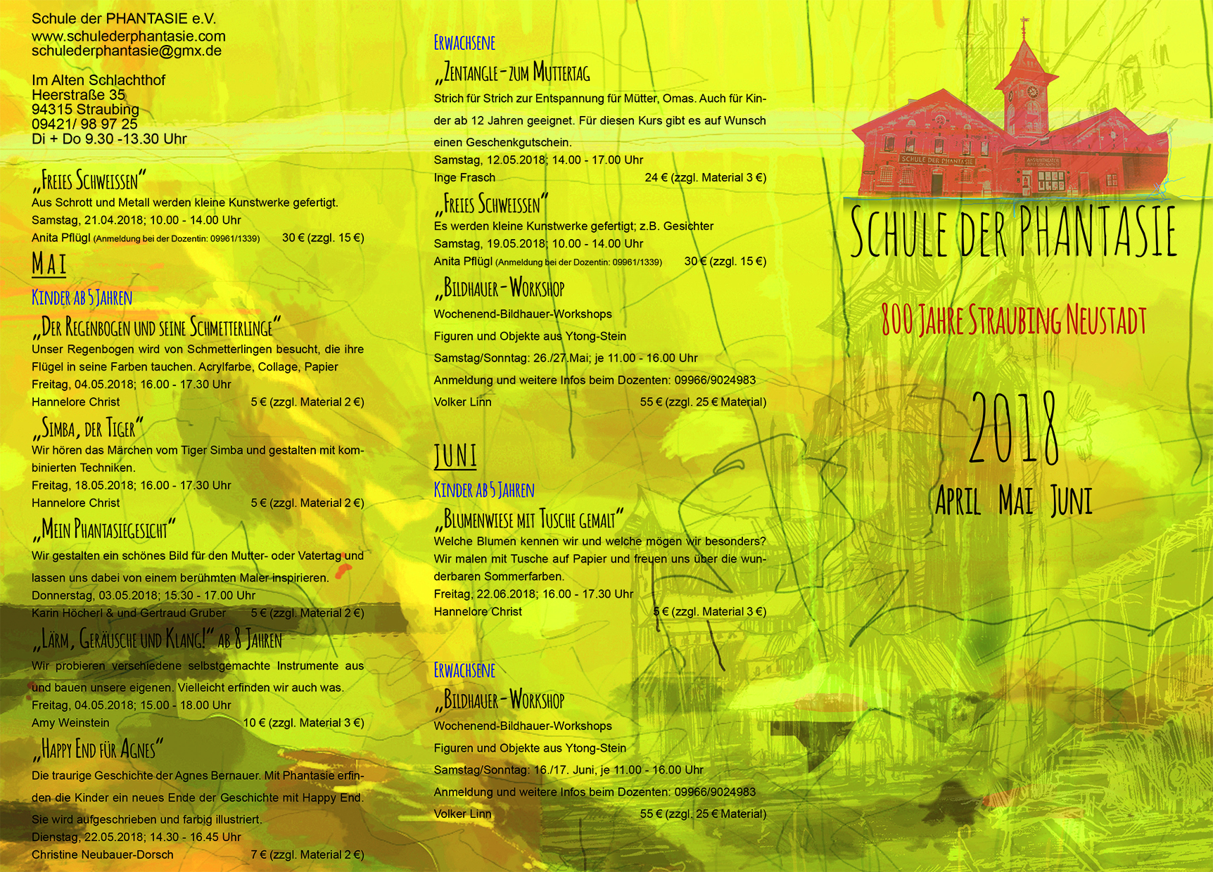 Kurse 2. Quartal 2018 + 800 Jahre Straubing Neustadt Verfasst von schulederphantasie am 21. März 20181. Mai 2018 *** Kursangebote für das 2. Quartal 2018 Mit extra Kursen für die 800 Jahr Feier – Straubing Neustadt Anmeldung in der Schule der Phantasie Di und Do 9.30 – 13.30 Uhr Hier als PDF-Datei Teilen mit: Klick, um auf Facebook zu teilen (Wird in neuem Fenster geöffnet) Facebook Klicken, um einem Freund einen Link per E-Mail zu senden (Wird in neuem Fenster geöffnet) E-Mail Gefällt mir Wird geladen …