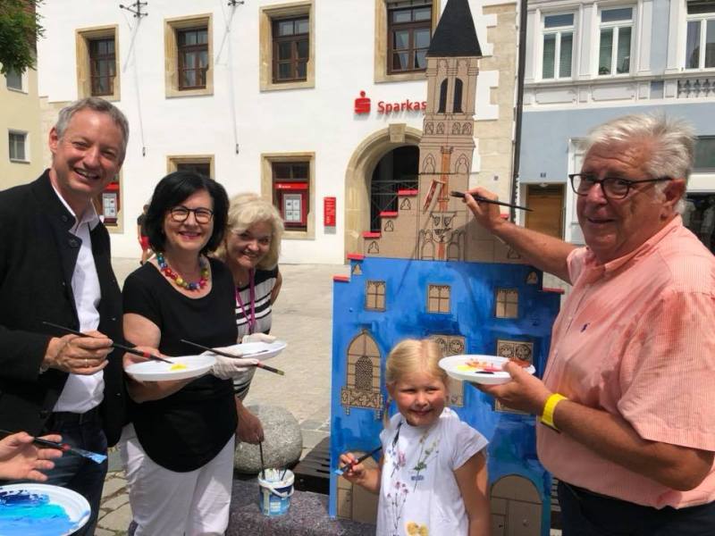 Die „Schule Der Phantasie“ hat heute eine tolle Kunstaktion am Theresienplatz durchgeführt. Wir haben die Gelegenheit gleich mal für einen Farbtest für die Rathausfassade genutzt. ![]()