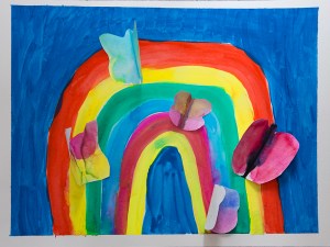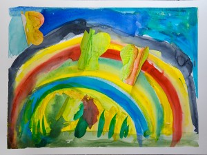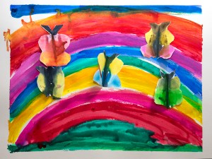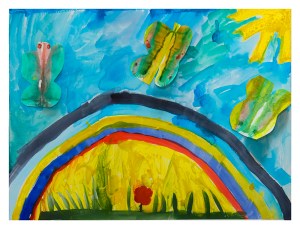 Wenn der Regen aufhört und einen Regenbogen an den Himmel zaubert, versammeln sich am Fuße des Regenbogens weiße Schmetterlinge. Dabei tauchen sie ihre Flügel immer wieder in das farbige Licht des Regenbogens und färben sie damit bunt….