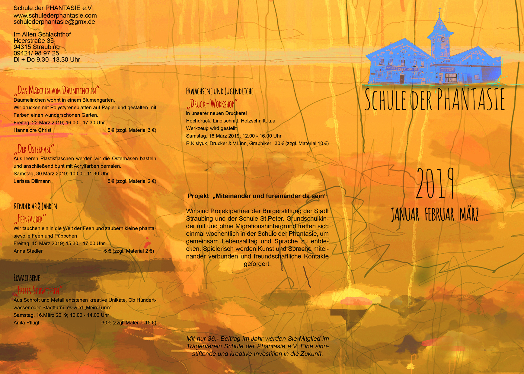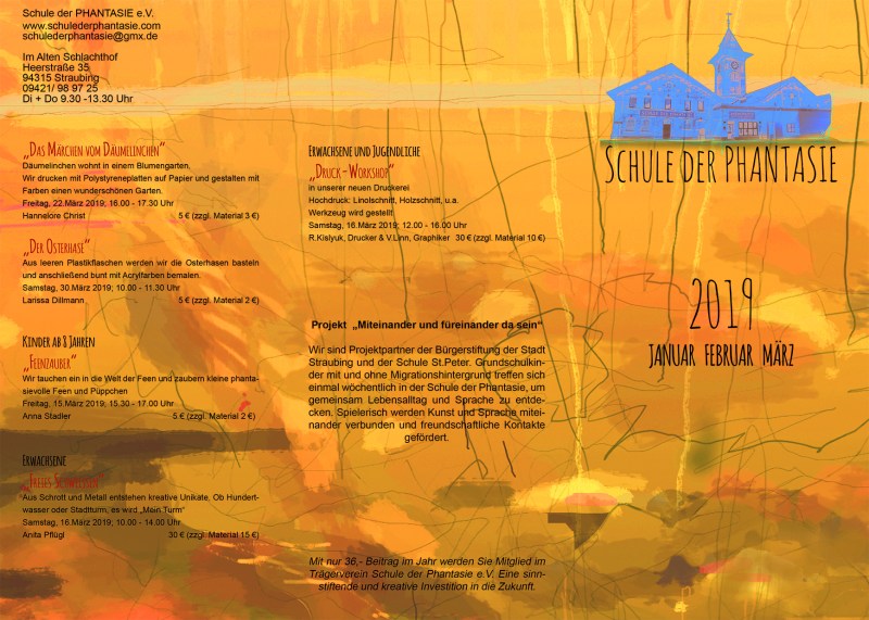 Projekt „Miteinander und füreinander da sein“. Wir sind Projektpartner der Bürgerstiftung der Stadt Straubing und der Schule St.Peter. Grundschulkinder mit und ohne Migrationshintergrund treffen sich einmal wöchentlich in der Schule der Phantasie, um gemeinsam Lebensalltag und Sprache zu entdecken. Spielerisch werden Kunst und Sprache miteinander verbunden und freundschaftliche Kontakte gefördert.
