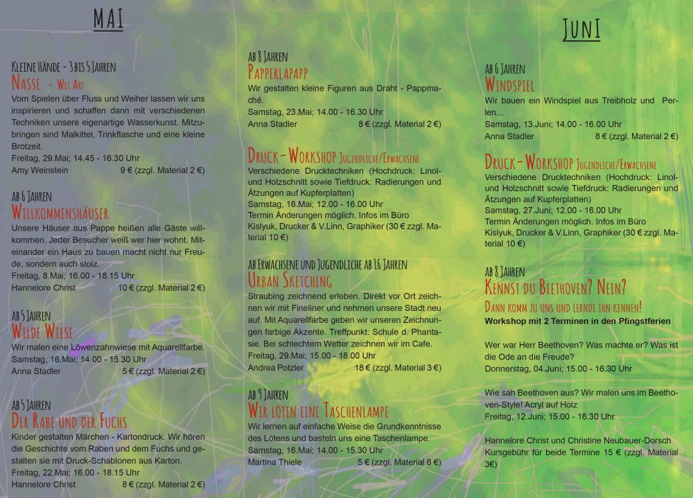 Wir hoffen im Mai wieder mit unseren kreativen Kursangeboten in den Frühling starten zu können.