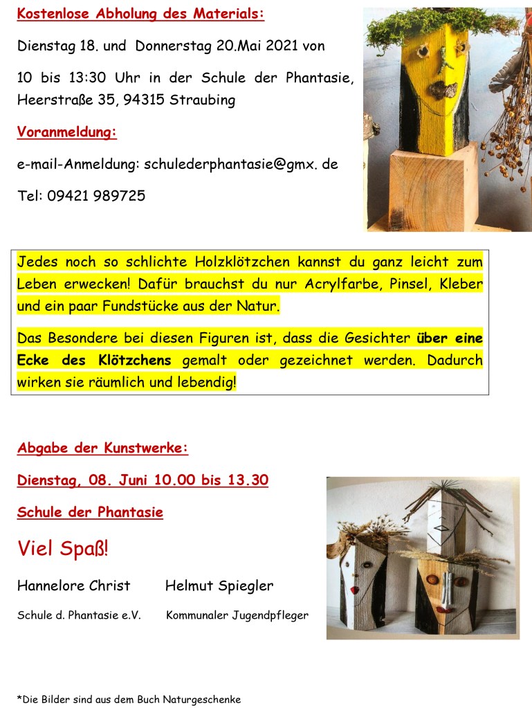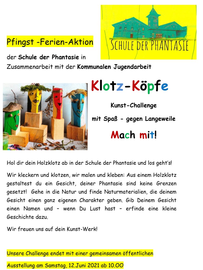 KlotzKöpfe – Kunst Challenge Verfasst von schulederphantasie am 17. Mai 202117. Mai 2021 Pfingst -Ferien-Aktionder Schule der Phantasie inZusammenarbeit mit der Kommunalen Jugendarbeit MACH MIT! Teilen mit: Klick, um auf Facebook zu teilen (Wird in neuem Fenster geöffnet) Facebook Klicken, um einem Freund einen Link per E-Mail zu senden (Wird in neuem Fenster geöffnet) E-Mail Gefällt mir Wird geladen …