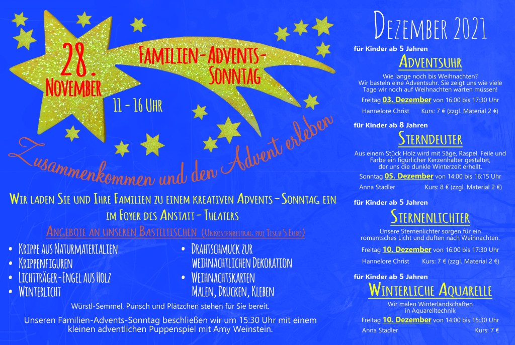 wir haben wieder ein tolles Programm zusammengestellt und starten mit unserem Familien-Advents-Sonntag am 28.November 2021 (Infos siehe Flyer)