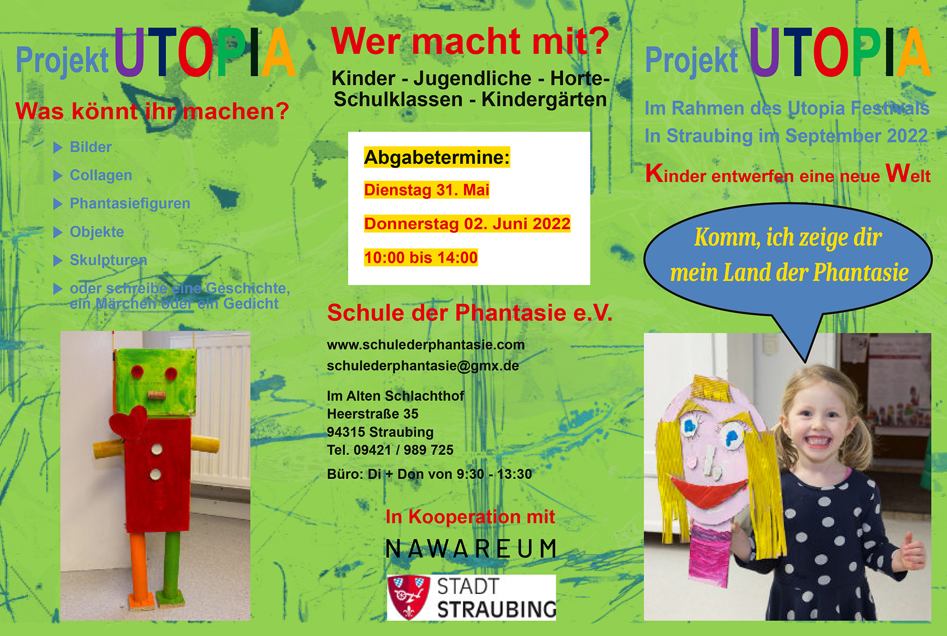 vom 11. bis 30. September 2022, wird in Zusammenarbeit mit der Stadt Straubing ein Kulturfestival mit dem Namen „UTOPIA“ stattfinden. Das Festival leitet Herrn Andreas Wiedermann. Viele Kulturschaffende, Wissenschaftler und Künstler beteiligen sich daran.