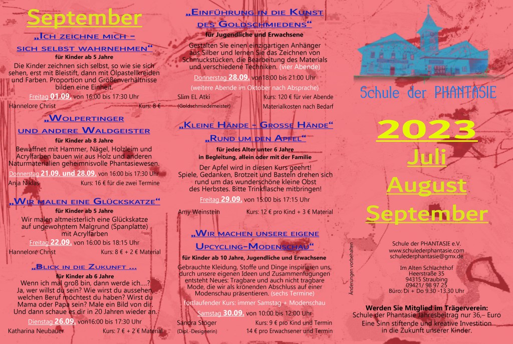 Kurse Juli, August, September 2023 Verfasst von schulederphantasie am 10. Juli 202310. Juli 2023 Teilen mit: Klick, um auf Facebook zu teilen (Wird in neuem Fenster geöffnet) Facebook Klicken, um einem Freund einen Link per E-Mail zu senden (Wird in neuem Fenster geöffnet) E-Mail Gefällt mir Wird geladen …