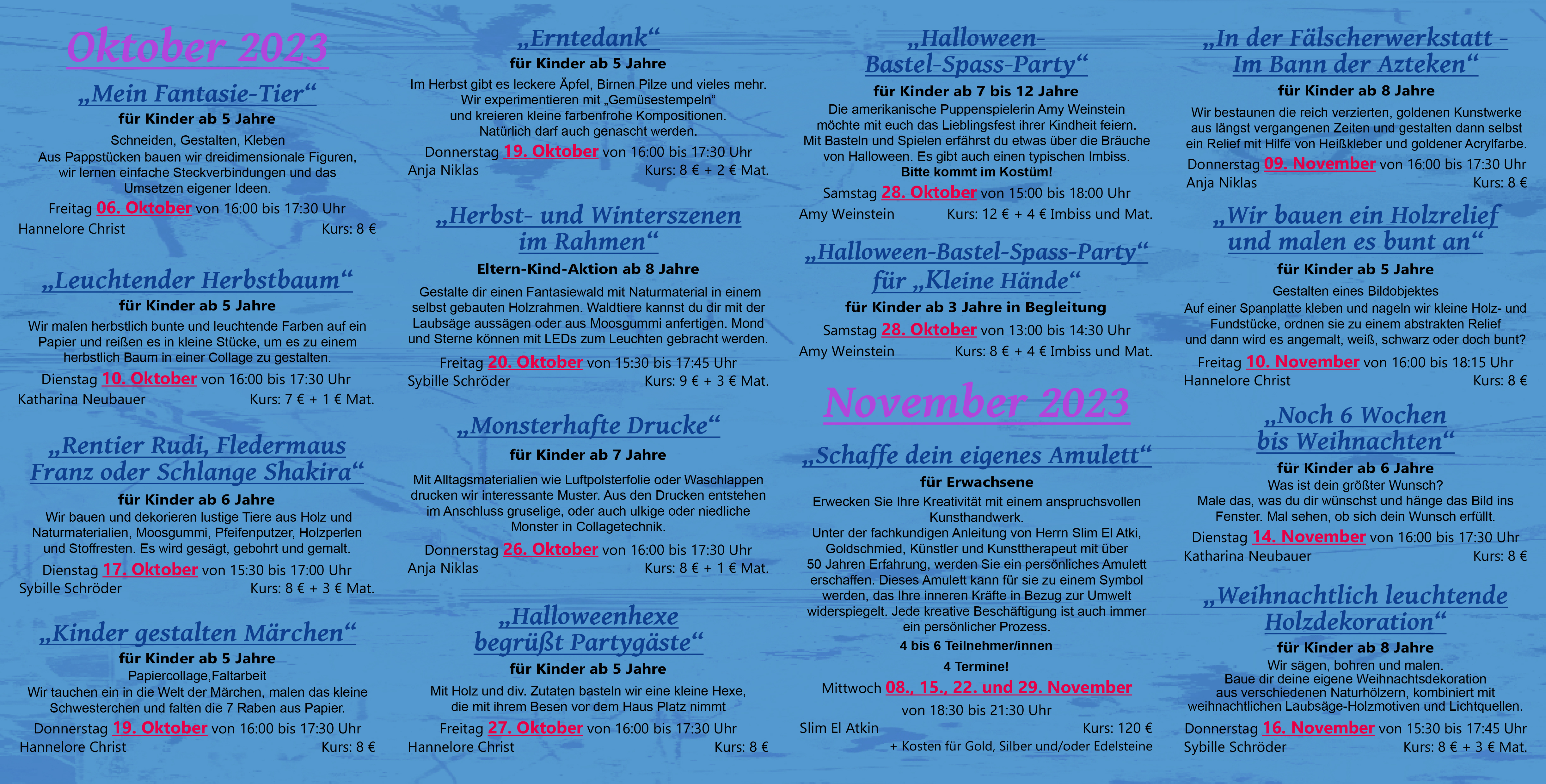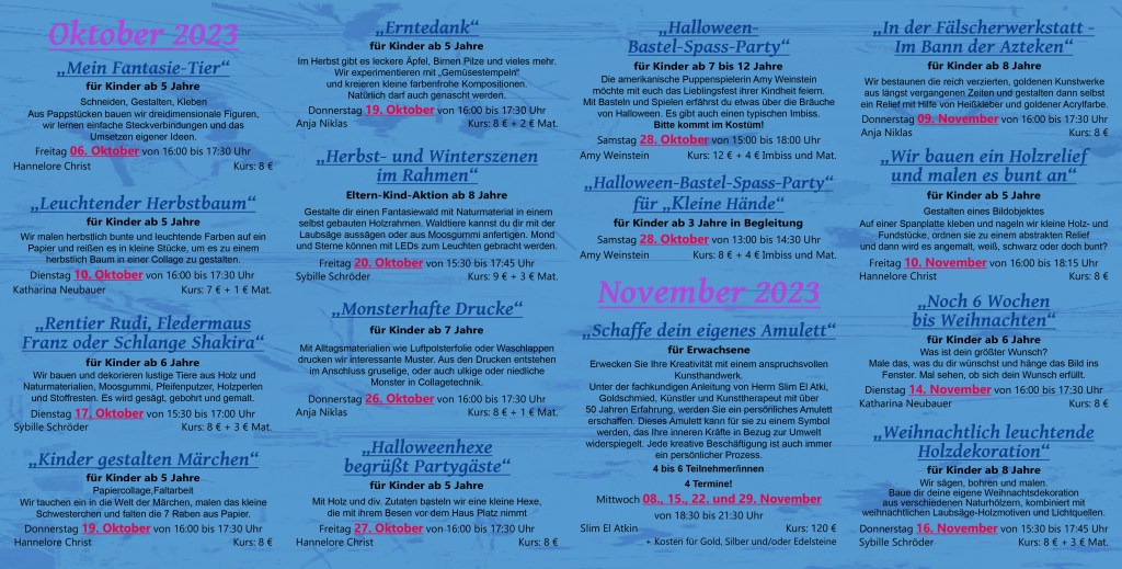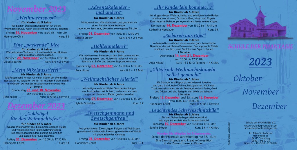Kurse Oktober, November, Dezember 2023 Verfasst von schulederphantasie am 4. Oktober 2023 Teilen mit: Klick, um auf Facebook zu teilen (Wird in neuem Fenster geöffnet) Facebook Klicken, um einem Freund einen Link per E-Mail zu senden (Wird in neuem Fenster geöffnet) E-Mail Gefällt mir Wird geladen …