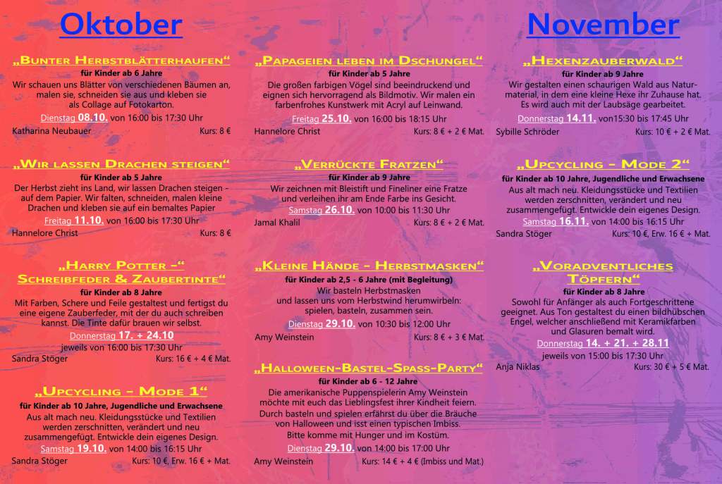 Kurse Oktober-November-Dezember 2024 Verfasst von schulederphantasie am 17. September 202423. Oktober 2024 Teilen mit: Klick, um auf Facebook zu teilen (Wird in neuem Fenster geöffnet) Facebook Klicken, um einem Freund einen Link per E-Mail zu senden (Wird in neuem Fenster geöffnet) E-Mail Gefällt mir Wird geladen …