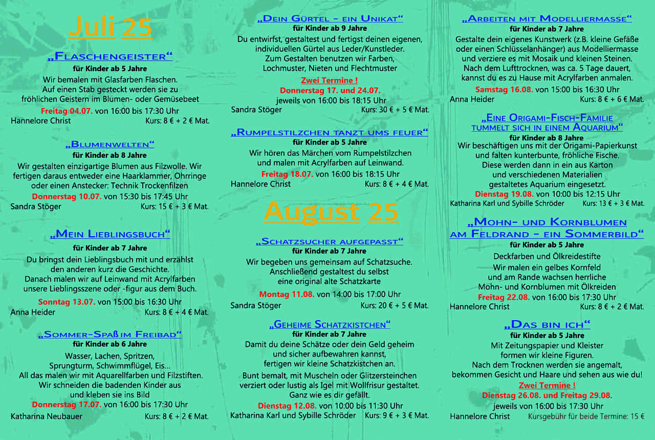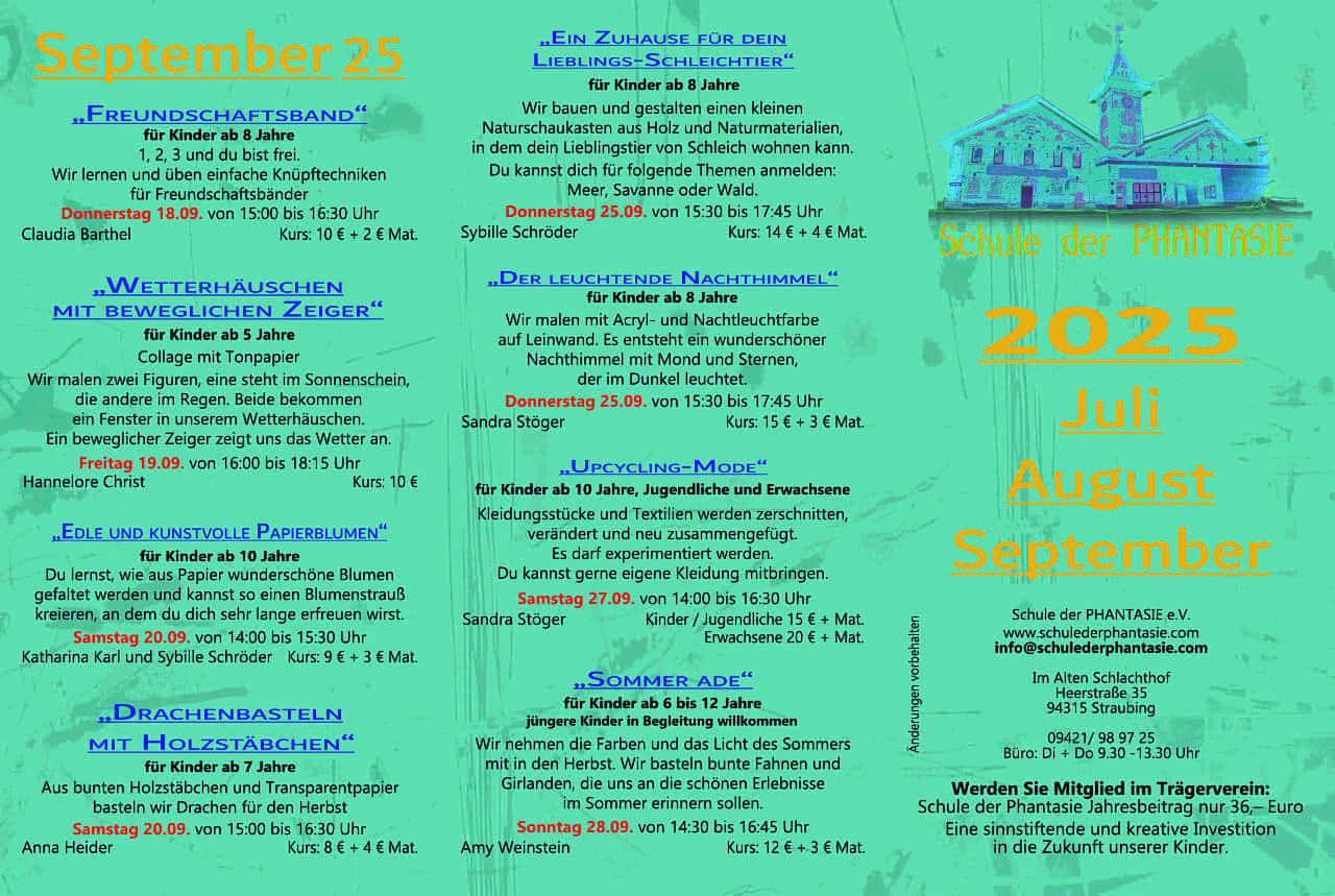Kurse Juli August September 2025 Verfasst von schulederphantasie am 8. Juli 202522. Januar 2026 Teilen mit: Auf Facebook teilen (Wird in neuem Fenster geöffnet) Facebook Einen Link per E-Mail an einen Freund senden (Wird in neuem Fenster geöffnet) E-Mail Gefällt mir Wird geladen …