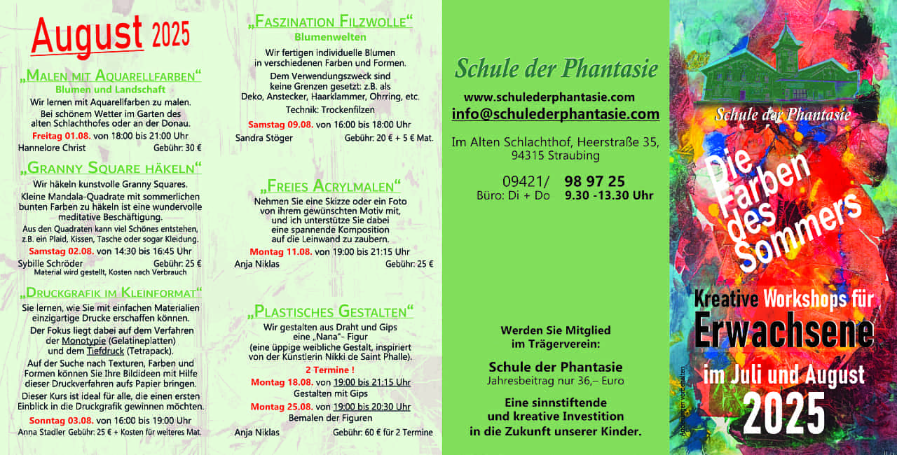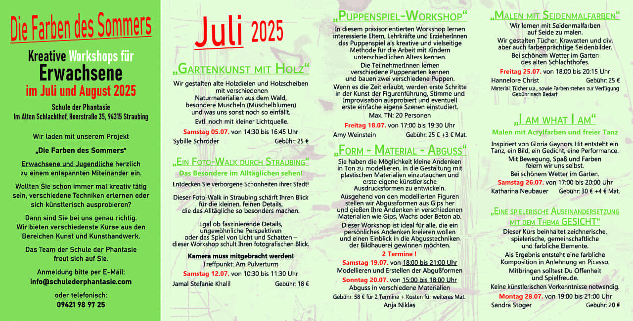 Workshops für Erwachsene Juli und August 2025 Verfasst von schulederphantasie am 8. Juli 202522. Januar 2026 Teilen mit: Auf Facebook teilen (Wird in neuem Fenster geöffnet) Facebook Einen Link per E-Mail an einen Freund senden (Wird in neuem Fenster geöffnet) E-Mail Gefällt mir Wird geladen …
