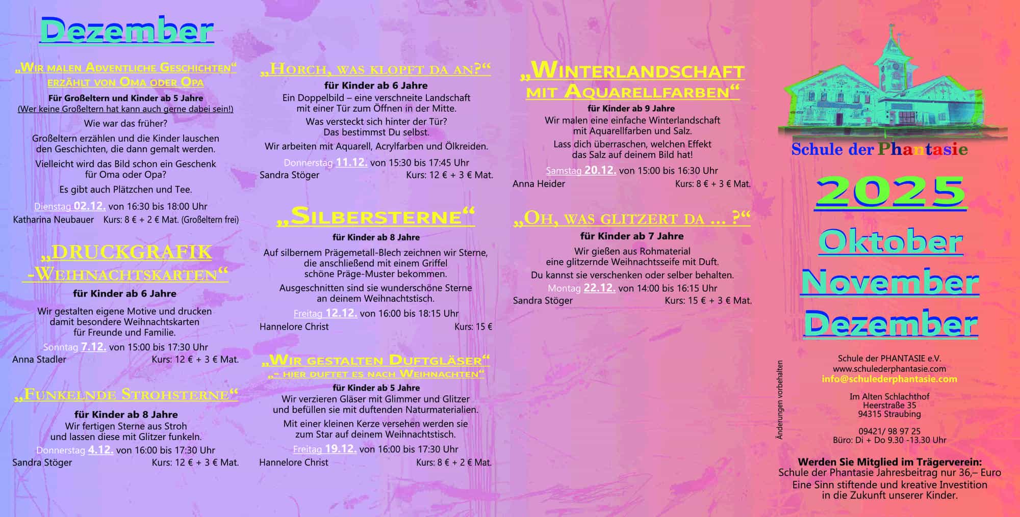 Kurse Oktober November Dezember 2025 Verfasst von schulederphantasie am 15. September 202522. Januar 2026 Teilen mit: Auf Facebook teilen (Wird in neuem Fenster geöffnet) Facebook Einen Link per E-Mail an einen Freund senden (Wird in neuem Fenster geöffnet) E-Mail Gefällt mir Wird geladen …